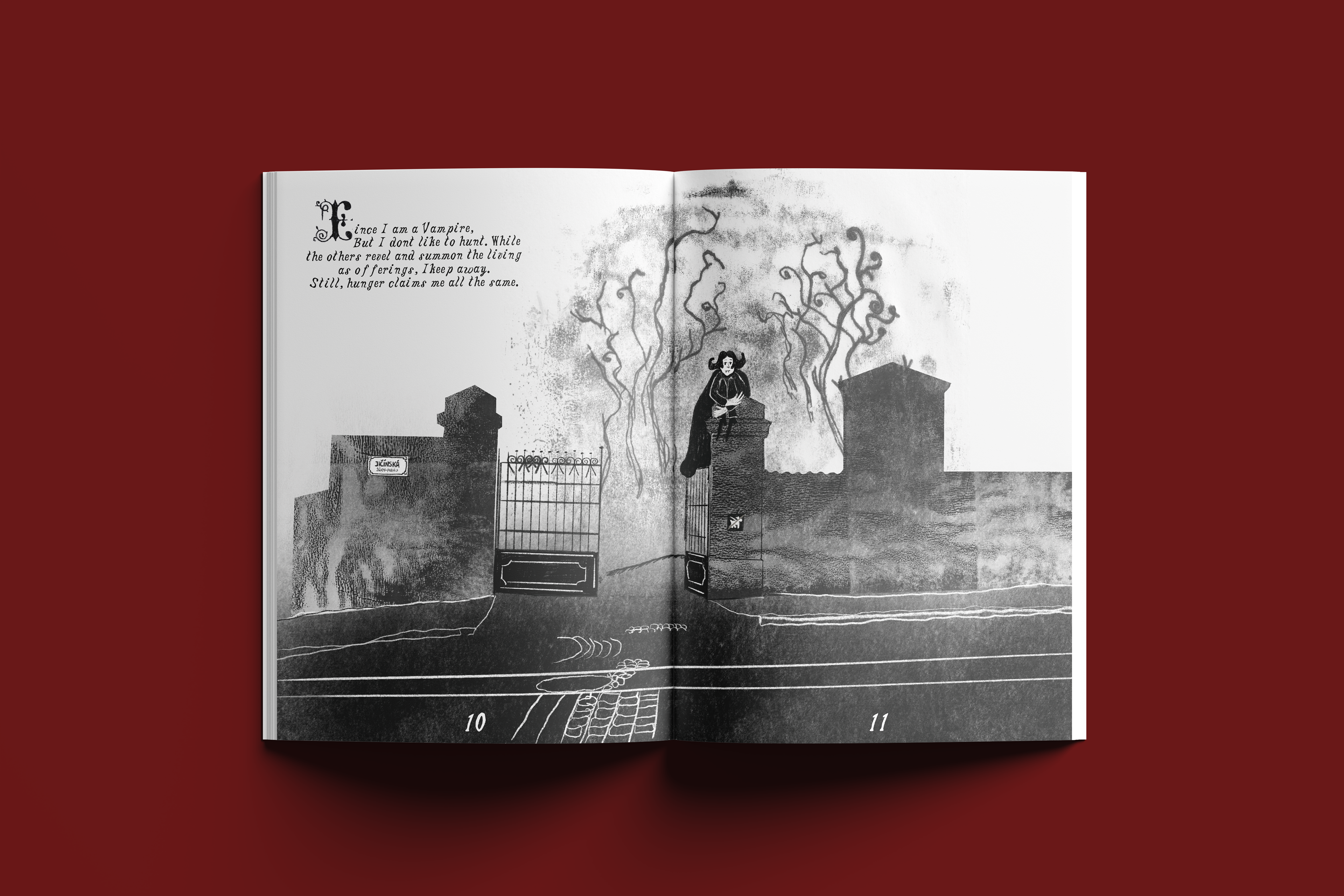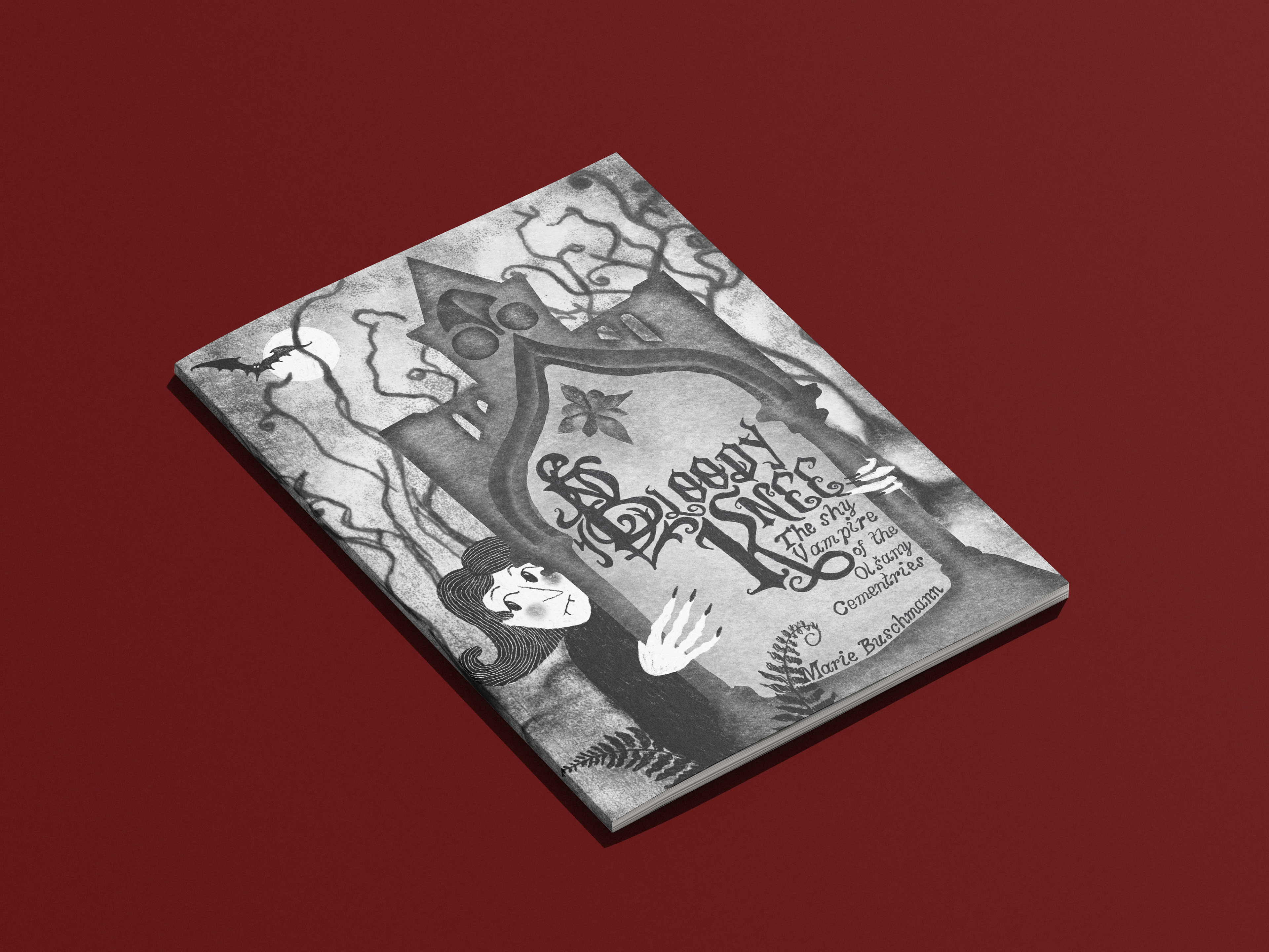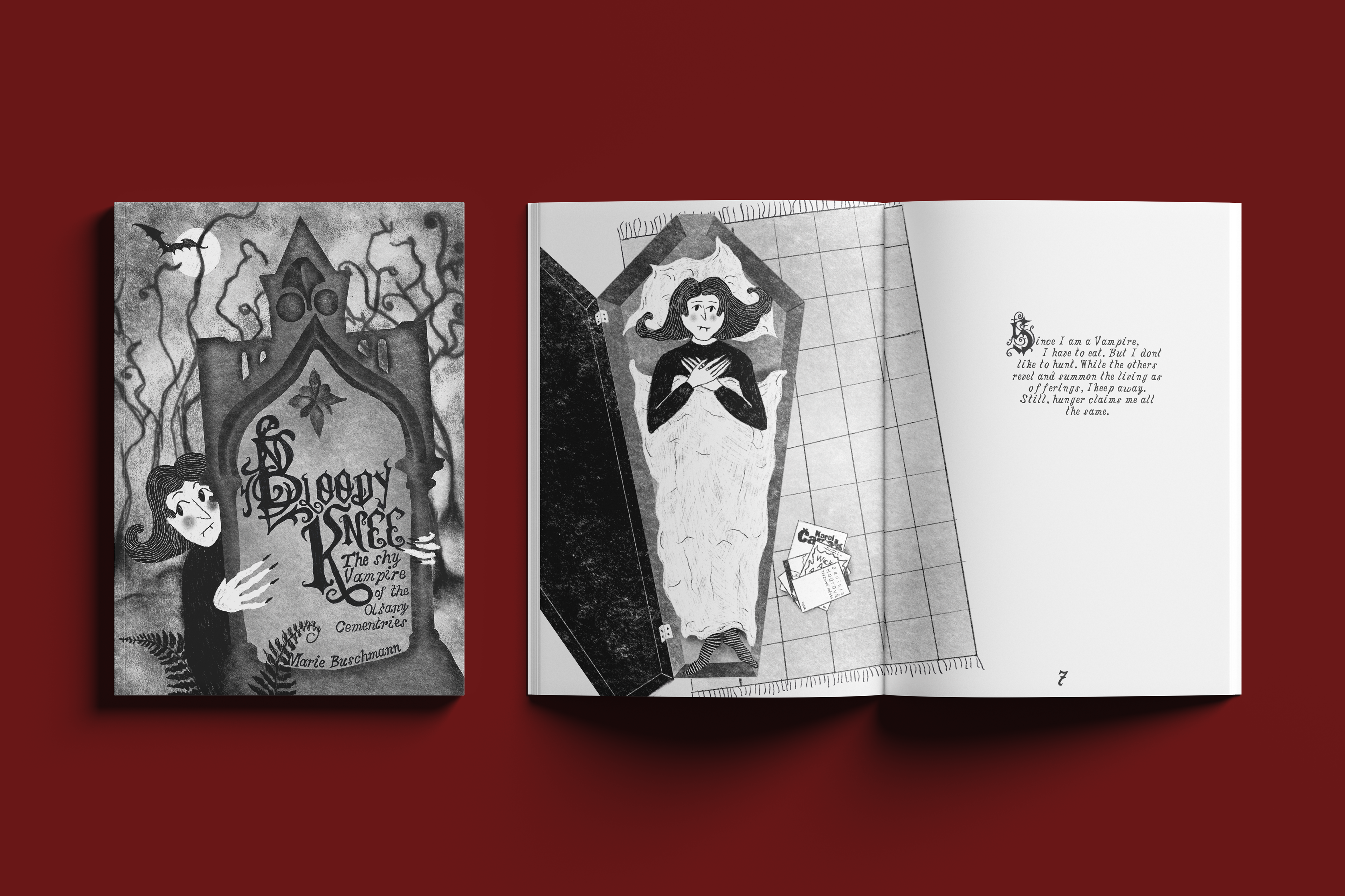 My name is Marie, and I am an illustrator and art educator based in Berlin. In summer 2025 I’ve spent three months in Prague for an internship at LUSTR Festival of Illustration and Comics. During this time, I lived right next to the Olšany Cemetery. Especially on hot summer days the cemetery offered a (literary) chill spot. Since I am a sucker for vampire stories anyways, stumbling across the legend of Bloody Knee made me want to bring their legend to new life. Bloody Knee is usually characterised as a loser, but in my story they are a shy hero. The characters that populate my illustrations oscillate between cuteness and strangeness and try to offer an opportunity for identification. I like comforting stories that take place in slightly weird narrative environments.